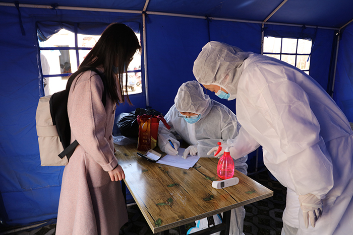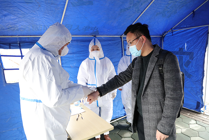 在学生进校测量体温环节,医务人员发现体温异常学生后,立即指引该生径直到临时医疗观察点,由应急处置医务人员进行体温复测和调查。如复测体温仍异常,医务人员立即联系定点医院,安排专车送院就诊,同时报告上级领导,相关工作人员对现场学生进行信息登记,对物品与环境进行彻底消毒,对密切接触者进行隔离,并通知学生家长。