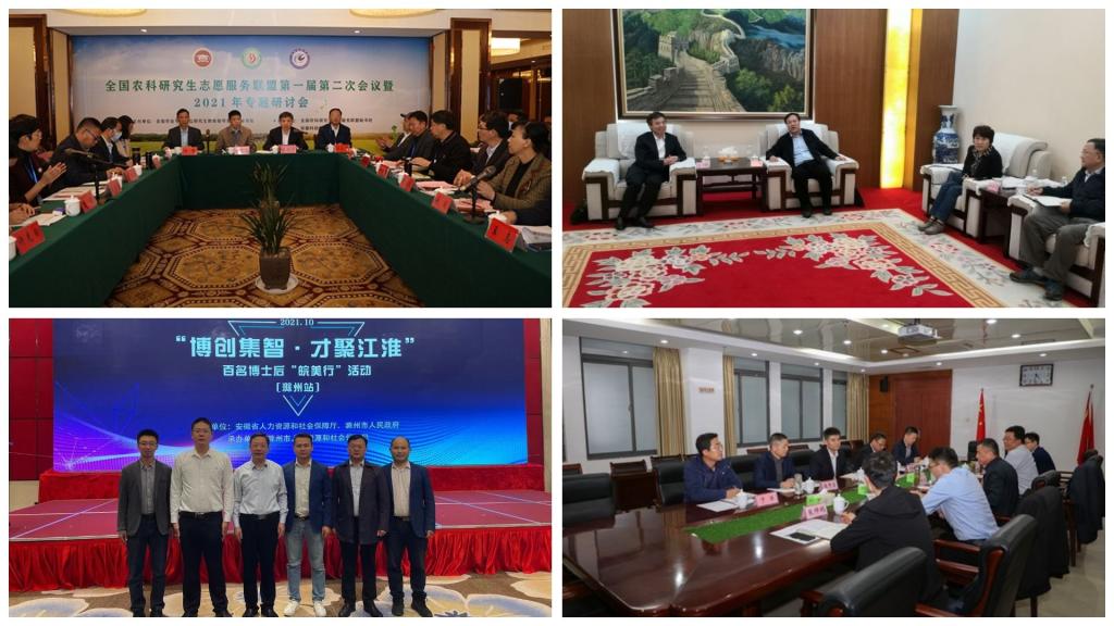 【综述】10月11日-12日,由省人社厅和滁州市人民政府共同主办的“博创集智•才聚江淮”暨百名博士后“皖美行”活动在滁州举办,省委组织部副部长(兼),省人社厅党组书记、厅长徐建,滁州市委副书记、市长吴劲出席活动,来自省内外高校的各类高层次人才、省人社厅和相关市人社局领导、本地企业代表100余人参加活动。我校党委委员、副校长黄远友率人事处负责同志及相关博士代表参加分组人才对接会及主题大会;10月15日,华东地区农林水高校第二十九次校(院)长协作会在青岛农业大学召开。来自米乐官方网站_米乐(中国)股份有限公司,、青岛农业大学、南京农业大学、上海海洋大学、浙江农林大学等16所华东地区农林水院校的领导出席,校党委书记蒋德勤受邀参会。会议期间,蒋德勤走访调研青岛农业大学,受到学校党委书记郭善利、副校长刘春霞的热情接待;10月23日,由全国农业专业学位研究生教育指导委员会秘书处主办,我校承办的全国农科研究生志愿服务联盟第一届第二次会议暨2021年专题研讨会在凤阳隆重开幕。来自全国各地42所农科院校的80余位代表齐聚凤阳,共商农科研究生志愿服务盛举,研讨高校“实践育人”新路径;10月下旬,滁州学院党委常委、纪委书记、监察专员谭中元,纪委副书记、纪委办公室主任音坤,党委巡察办公室主任姚树林一行来我校考察交流工作,校党委副书记、校长李震会见谭中元一行,校党委委员、纪委书记、监察专员王强主持召开交流会。谭中元一行还参观了龙湖校区校史馆。
