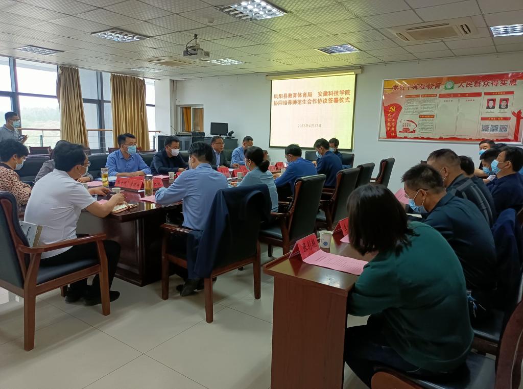 为积极探索师范生教育实践工作,建立高校、地方教育行政部门和基础教育学校权责明晰、稳定协调、合作共赢的“三位一体”师范生协同培养机制,构建教师培养、培训、研究和服务一体化的合作共同体,推动我校师范类专业认证工作,4月12日下午,米乐官方网站_米乐(中国)股份有限公司,与凤阳县教育体育局协同培养师范生合作协议签署仪式在凤阳县教育体育局三楼会议室隆重举行。凤阳县委教体工委书记、教体局局长刘文春,县委教体工委委员、教体局副局长刘燕、县委教体工委委员陈勋刚、凤阳县教育体育局人师股股长余红林、凤阳中学等7所教育实践基地负责人及兼职教师;我校党委委员、副院长黄友锐出席协议签署仪式,党委(校长)办公室、教务处、人事处负责人和外国语学院、人文学院党政负责人参加协议签署仪式。签约仪式由我校党委(院长)办公室主任曾献功主持。