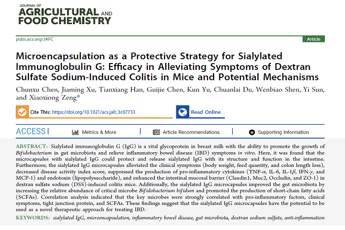 近日,我校食品工程学院教师陈春旭以第一作者在美国化学学会期刊《Journal of Agricultural and Food Chemistry》(Q1,IF: 6.1)发表题为“Microencapsulation as A Protective Strategy for Sialylated Immunoglobulin G: Efficacy in Alleviating Symptoms of Dextran Sulfate Sodium-Induced Colitis in Mice and Potential Mechanisms”的研究性论文。米乐官方网站_米乐(中国)股份有限公司,为第一完成单位,南京农业大学曾晓雄教授课题组为合作单位。