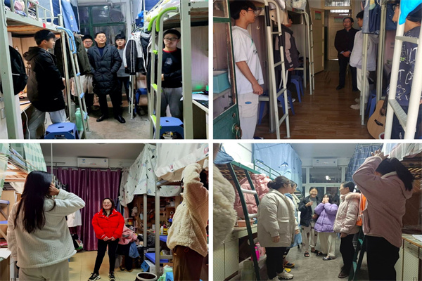 沈树周一行人先后进入各个学生寝室,亲切向同学们问好,了解生活学习状况,希望同学们提高安全防范意识,加强日常交流,创造浓厚的学习氛围。沈树周希望同学们认真备考,加强复习力度,相互监督,保证按时按质完成课程考核任务。在了解了宿舍生活情况之后,沈树周询问同学们日常生活中遇到的问题并给予生活建议,同时对寝室卫生进行检查。最后强调各寝室长务必落实好寝室安全管理制度,不得无故外宿,养成良好的作息习惯,争创文明宿舍、学习型宿舍。检查之后,老师们叮咛同学们一定要注意寝室安全,安全用电,禁止晚归,同时要注意保持寝室的整洁、并希望学生干部做好实践带头作用。