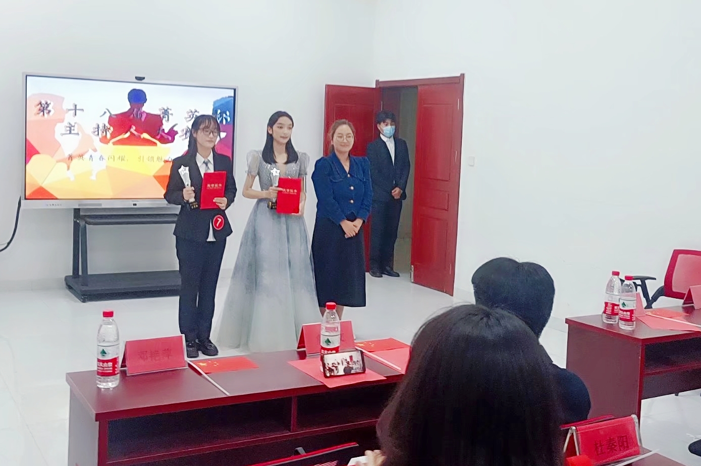 决赛邀请了我校七位学生评委。生命与健康科学学院党委书记、菁英主持社指导老师詹学文,校团委副书记张聪,校团委组宣部主任张古品,生命与健康科学学院正科级辅导员兼正科级组织员、演讲与口才协会指导老师邓艳萍作为特邀嘉宾现场指导。