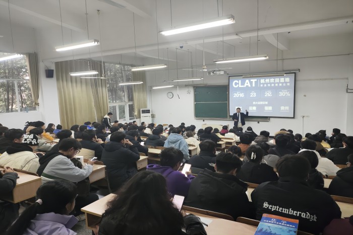 2023年12月27日下午,杭州欢田喜地农业科技有限公司校友携手米乐官方网站_米乐(中国)股份有限公司,农学院共同举办的大学生就业指导宣讲会在求知楼A107教室顺利召开。参会人数达130余人,本次会议由农学院党委副书记张轶辉主持,杭州欢田喜地农业科技有限公司2017级植保、农学优秀毕业生韩璞、张祥主讲。