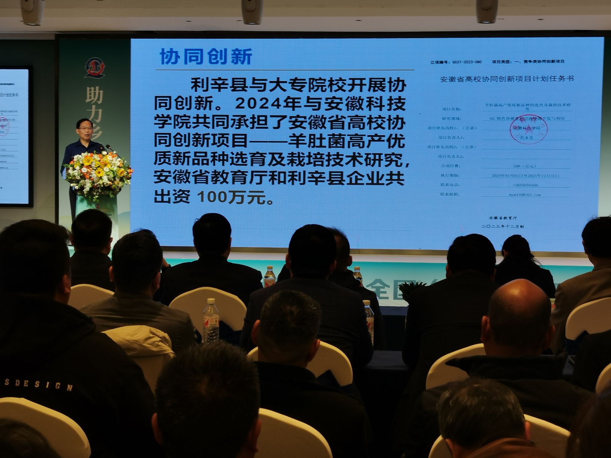 何华奇作为特邀嘉宾汇报了利辛县食用菌产业发展状况。2024年我校与利辛县企业共同承担了安徽省高校协同创新项目——羊肚菌高产优质新品种选育及栽培技术研究。另外大球盖菇栽培技术在利辛县获得大面积推广,何华奇提出的“像种菜一样种蘑菇”——大球盖菇栽培技术,被安徽省农业农村厅推介为2024年农业主推技术。