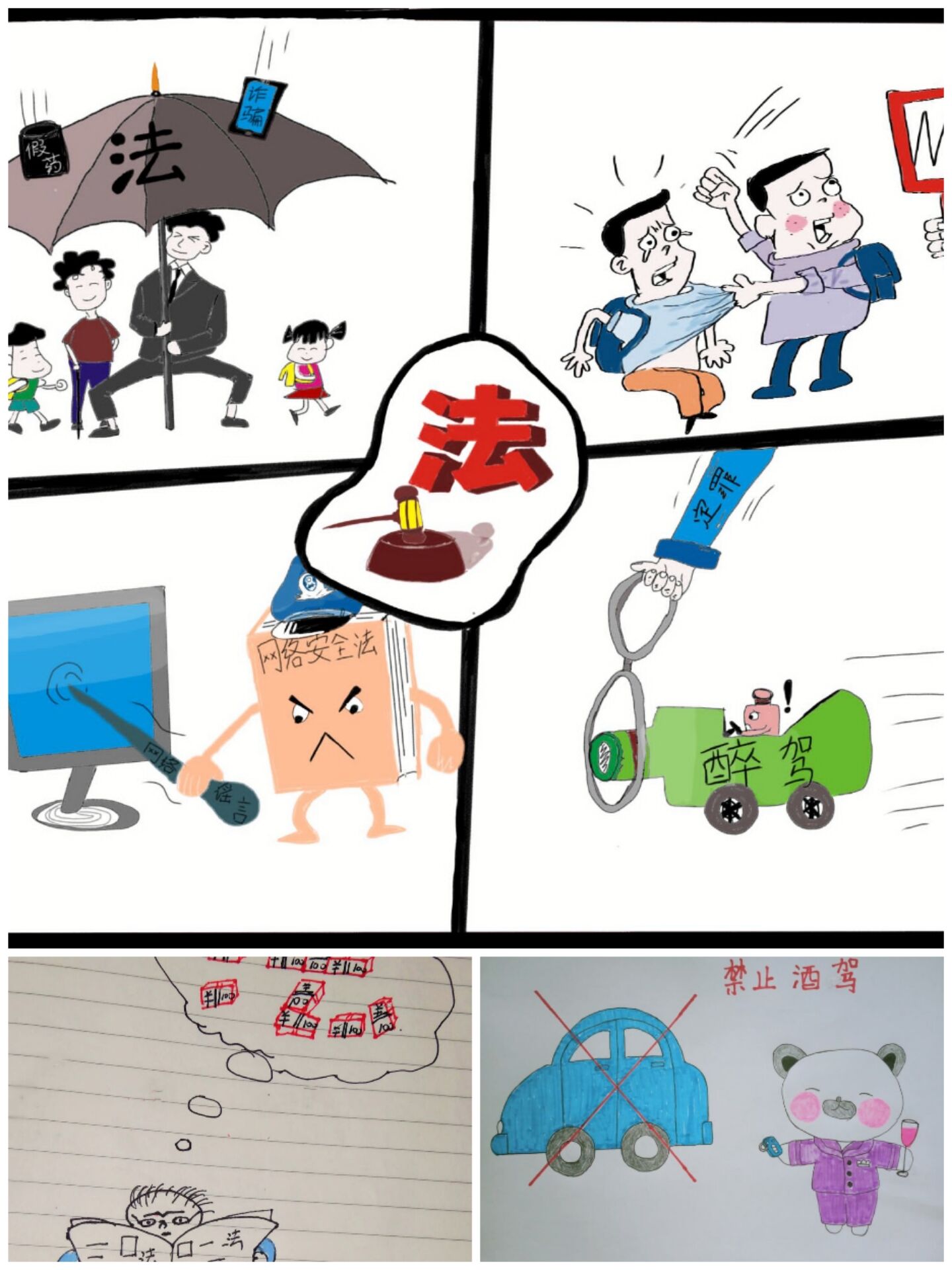 主题活动分为法律文化知识征文比赛和法治漫画比赛两部分,由参赛人员将其作品进行投稿,工作人员将作品上传至易班进行线上投票。活动期间,学生们皆踊跃参加,征文比赛中,选手们皆妙笔生花,以真实的笔触抒发出自己对法律最崇高的敬意,从他们的作品中,可以看出法律对国家、对社会、对个人的重要的作用;漫画比赛中,选手们以精湛的画技,充满寓意的构图,意味深长的配字对自己心中的法律进行了刻画,作品大多以宣传遵纪守法的社会公德为内容。学生们对此次活动十分关注,也积极进行了投票,评选出自己心仪的作品,最终,征文中,法学192贺成杰获得一等奖,法学182高冰瑾、法学181邓慧玲获得二等奖,汉语言文学192张璇、法学191方翠翠、法学182王珊获得三等奖。漫画比赛中,法学182储珊珊获得一等奖,汉语言文学182杨文琦、法学182陈娜娜获得二等奖,法学192俞红、汉语言文学192张良昊旻、汉语言文学191蒋青青获得三等奖。