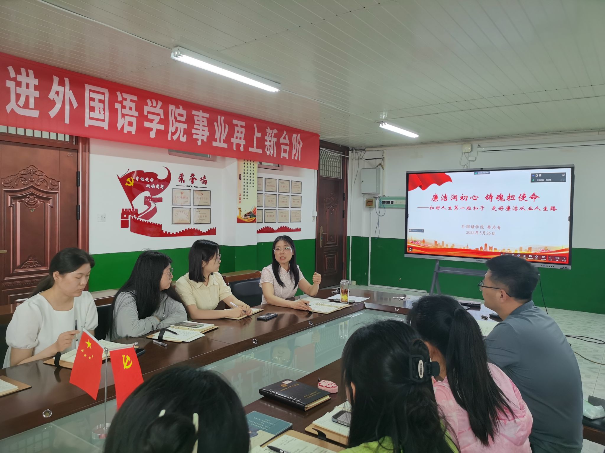 为进一步加强毕业生党员党性教育,打好廉洁从业的“预防针”,5月26日,外国语学院在学院会议室组织了2024届毕业生党员廉洁入职专题党课。党课由学院党委书记蔡为青主讲,党委副书记、纪委书记张海亮,学院党政办主任、毕业班辅导员陈慧中以及全体毕业生党员共同聆听党课。