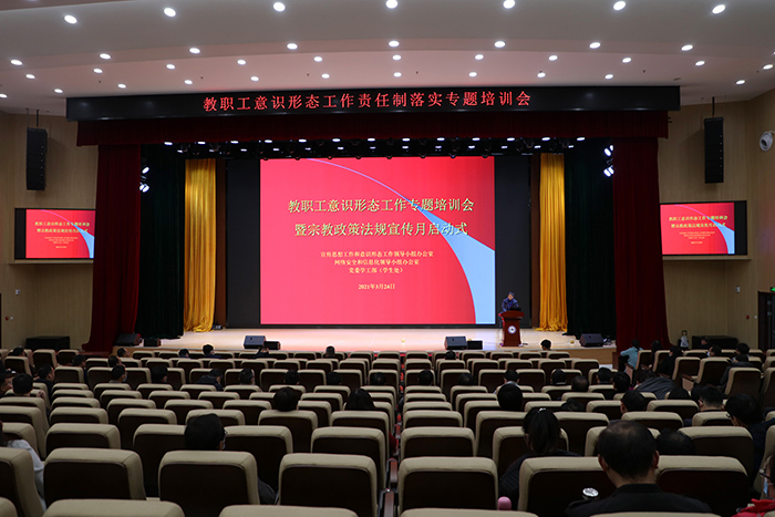 3月24日下午,学校分别在凤阳校区、龙湖校区举办了教职工意识形态工作专题培训会暨宗教政策法规宣传月启动式。宣传思想工作和意识形态工作领导小组办公室主任、党委宣传(统战)部部长卫胜以“高校教职工要自觉扛起意识形态工作责任”为题作了主旨发言。会议由网络安全和信息化领导小组办公室主任、网络与信息技术中心主任胡振江主持。