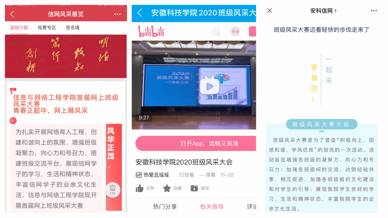 在评选推优阶段,经过初步筛选的9个班级,通过易班平台搭载学生常用的bilibili视频软件,进行为期一周的投票展示,学院微信公众号和学生会官方QQ同步推广,联合形成网上传播矩阵。