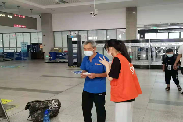 活动前,志愿者们认真参加岗前培训,详细了解工作内容和工作原则,学习工作方法和流程。随后,志愿者们在售票大厅、服务台、进出站口、候车处等开展服务,为旅客提供行路指引,回答旅客的咨询,协助公共秩序引导,为老弱病残孕旅客提拿行李等等。在志愿服务期间,受河南省罕见特大暴雨、江浙沪超强台风“烟花“影响,途径阜阳北站管内辖区多趟列车停运、晚点。由于停运车次只能在人工窗口退票,售票大厅排满了退票、改签、购票的旅客。仅20,21日两天,阜阳站共计退票近20000张。同时,随着疫情的再次反复,志愿者们的工作量大幅增加,他们取消了午休时间,全天坚守岗位协助工作人员进行通行码核验,政策宣传、解释和引导工作。