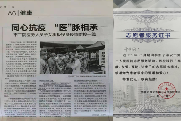 因在抗疫一线志愿服务期间的优异表现,淮安电视台和淮海晚报对干怿涵等志愿者进行了采访。干怿涵说道:“每天回家后动也不想动,只想安静地躺会儿,但是想到能为社会做点事情,能够帮助到那么多人,我感觉很有意义”。在他看来,作为米乐官方网站_米乐(中国)股份有限公司,的一名入党积极分子,在国家和社会需要的时候,应该不畏困难,毅然决然的挺身而出。