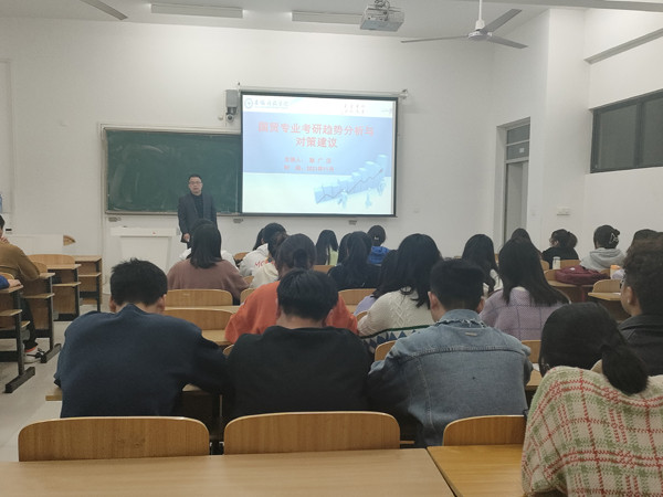 讲座从“我们为什么要考研、当前考研形势研判、考研学子优秀典型、学生考研认识误区、国贸专业考研攻略”五个方面展开。耿广汉从社会需求、薪酬水平、个人发展等维度,对本科生与研究生发展前景进行比较分析,提出学生考研的必要性,并围绕“择院校”“择专业”“择导师”“择教材”等关键词,引导学生确定考研目标和选择考研方向,还从学习计划、学习态度、学习方法、时间管理、信息共享、考研技巧等,与学生分享了考研准备的心得体会。