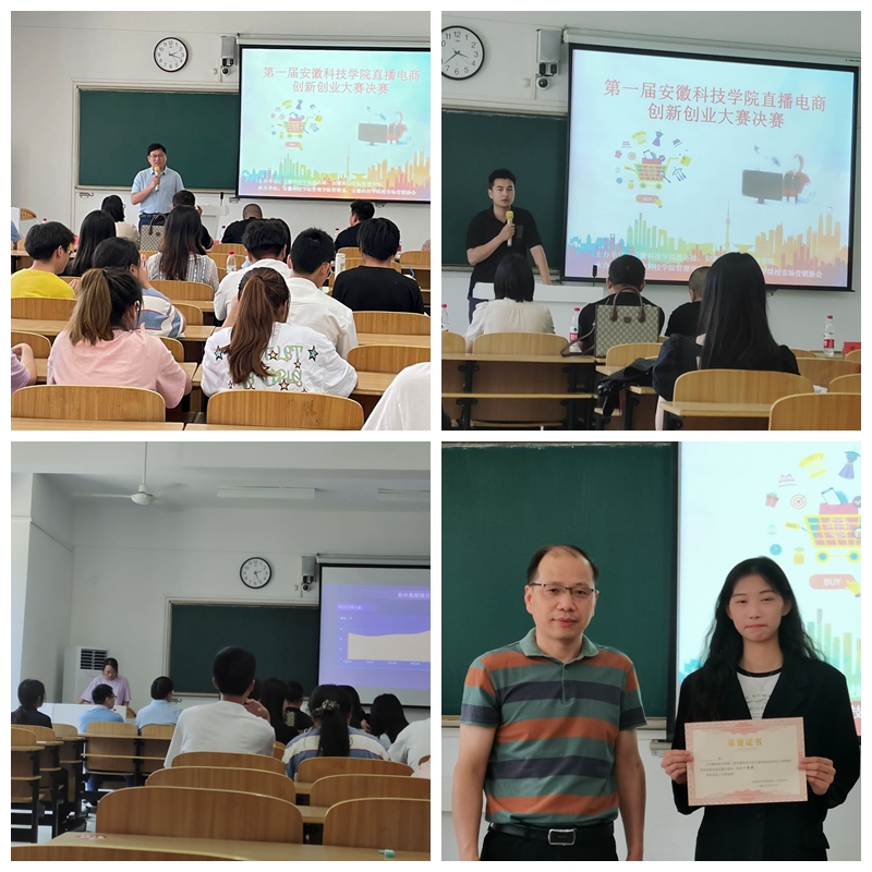 决赛评委由安徽国兰网络科技有限公司运营总监罗伟、管理学院市场营销系主任刘宗飞及市场营销系刘菊、张红军、窦佳丽老师共同担任。经过前面三个阶段的比赛,最终有八支队伍进入决赛。参赛选手通过PPT讲述、视频展播等方式,或记录多姿的校园生活,或讲述家乡的美景特色与风土人情,展示了比赛前期培训和实操环节所取得的成果,同时介绍了其直播电商创业项目的未来规划,并认真回答了评委老师的提问。经过激烈的比赛,最终“买它买它就队”获得了一等奖。