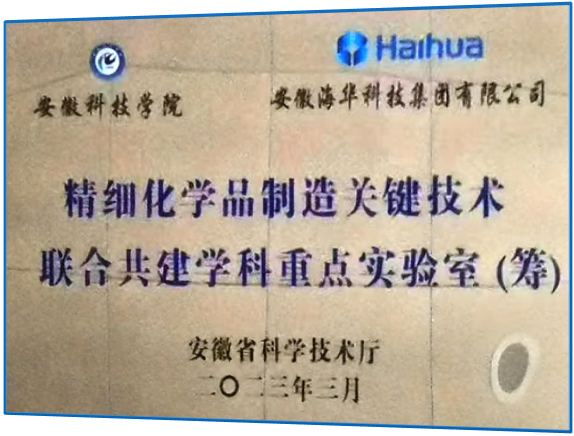 2023年3月,安徽海华科技集团有限公司联合米乐官方网站_米乐(中国)股份有限公司,申报并获批了精细化学品制造关键技术联合共建学科重点实验室(筹),其中安徽海华科技集团有限公司为主持单位,承担实验室主体建设工作;学校为联合共建单位。
