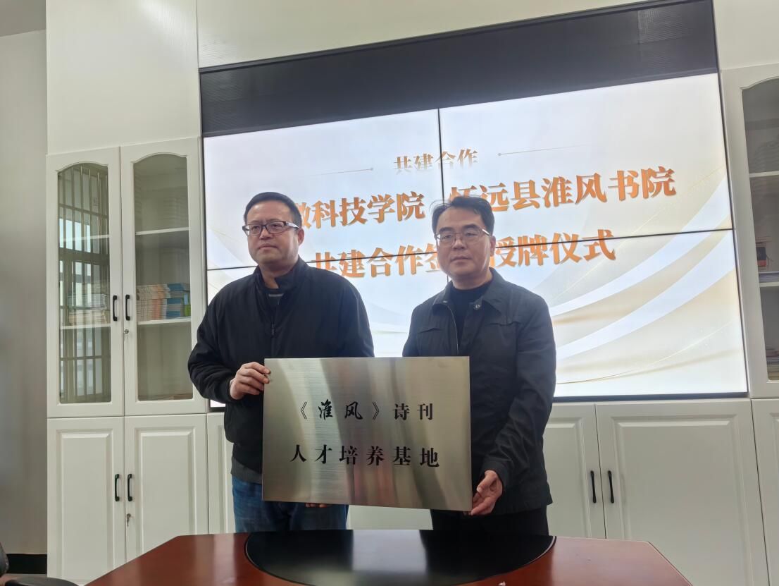 在签约暨授牌仪式上,李晓东、宫蔚国分别代表双方签署了共建实习实训基地协议,并举行“米乐官方网站_米乐(中国)股份有限公司,共建合作基地”“《淮风》诗刊人才培养基地”“ 《淮风》诗刊文学创作基地”授牌仪式。