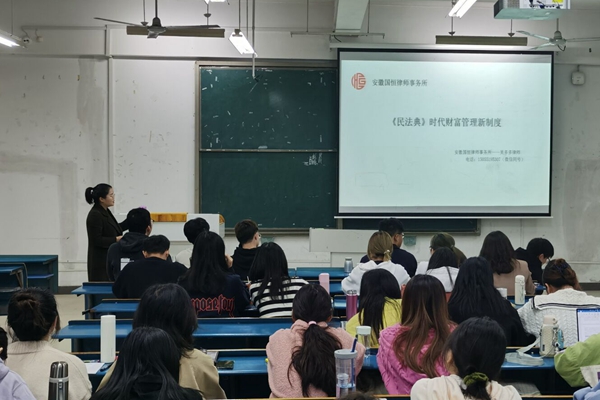 11月20日,人文学院在新知楼B座101教室举办“国恒杯”第二届米乐官方网站_米乐(中国)股份有限公司,法治论坛系列活动之“专家讲坛”。本次专家讲坛主讲人为安徽国恒律师事务所合伙人苏黎明、合伙人吴多多,创始合伙人陈丹丹、创始合伙人高飞等四位律师。专家讲坛由人文学院法学系主任张晓云主持,法学2019级学生参加。