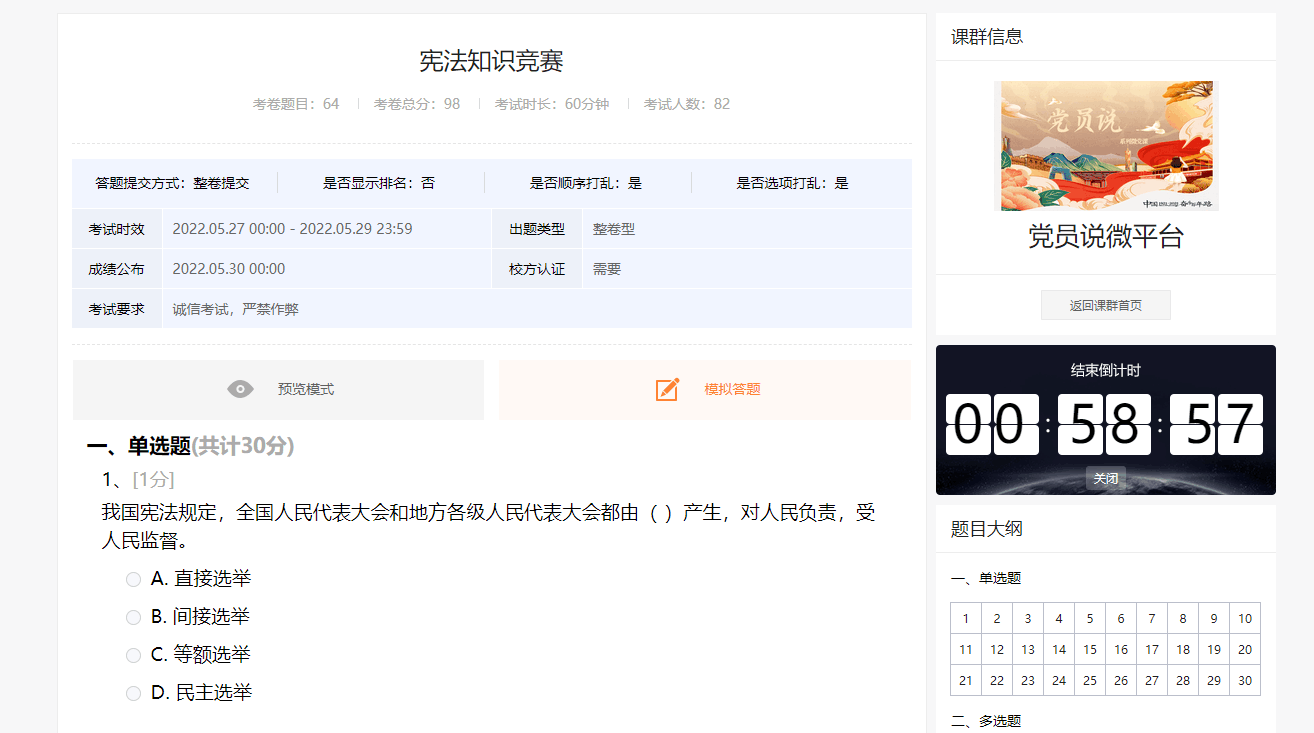 此次活动采用线上考试的形式,通过单选题、多选题和判断题来全方位考查同学们对《中华人民共和国宪法》及宪法修正案相关知识的了解和思考。考试内容包括宪法发展史,宪法的地位、作用、基本精神,宪法的主要内容以及对宪法的解读和建议。通过本次答题,有助于大学生增进对宪法知识的了解,形成自己的感悟和思考,使法律和法治意识真正融入到大家的成长之中。