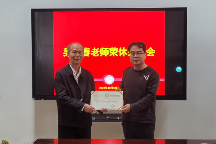 李晓东、牛永辉分别为吴贵春颁发了荣誉证书和纪念品;李沙娜代表学院全体师生献上鲜花。