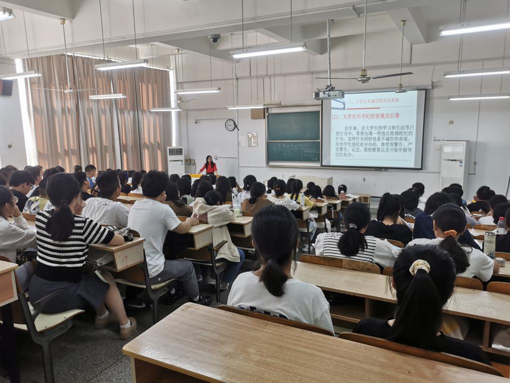 鲁冰冰讲述了诚信的含义与重要性,列举了少数大学生不守纪、不守法、不守信的突出表现及严重后果。她指出,大学生在生活方面应当遵规守纪、自尊自爱;在学习方面应当遵守课堂秩序,创建良好学风;在学术、资助、求职就业方面应该诚实守信。她带领全体新生学习了《米乐官方网站_米乐(中国)股份有限公司,学生日常行为规范》,讲述了大学生校园礼仪的重要性,在宿舍群体生活礼仪、校园课堂礼仪、师生交往礼仪、参加校园集体活动礼仪等方面提出了具体要求,认真回答了同学们就学习生活方面提出的具体问题,帮助新生更好的完成“大学生”身份的转变。