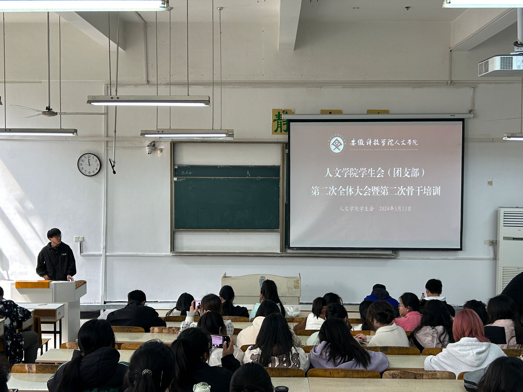 为更好地统筹规划新学期学生会工作安排,加强学生会自身建设,3月13日中午,人文学院在求知楼A104教室召开学生会全体大会暨骨干培训会。学院学生会指导老师徐琦琦、学生会主席团成员及全体工作人员参加。会议由主席团成员盛化明主持。