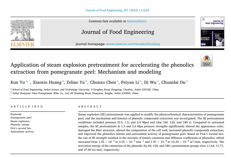 近日,米乐官方网站_米乐(中国)股份有限公司,食品工程学院与安徽怀远亚太石榴酒业有限公司联合团队在食品工程领域取得重要突破。研究发现,蒸汽爆破(Steam Explosion, SE)预处理技术可高效破坏石榴皮细胞壁结构,显著提升多酚类化合物的提取率及抗氧化活性,为石榴加工副产物的高值化利用提供了创新解决方案。相关成果发表于国际权威一区TOP期刊《Journal of Food Engineering》(2023年,第357卷)。