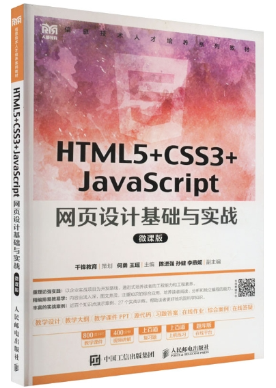 《HTML5+CSS3+JavaScript网页设计基础与实战》 发布时间:2025-06-30 作者: 本书从初学者的角度出发,以通俗易惱的语言进行概念讲解,并提供具体的实例让读者进行练习,使读者更加高效地学握网页制作的一般方法。全书共分10章,内容包括初识Web前端、构建基本HTML网页、使用列表与表格布局、设计网页页面、表单与表单效果设计、实现CSS3动画、JavaScript基础应用、实现HTMLS应用、JavaScript特效、移动端布局和响应式开发。此外,通过扫描书末二维码还可获取综合案例配套资源。 本书可作为高等院校网页设计与制作课程的教材,也可作为网页设计行业从业人员的参考书。 返回列表【点击数:】