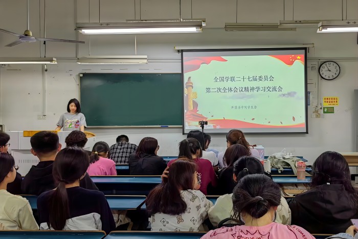 5月26日晚,外国语学院学生会在求知楼B座106教室举办全国学联第二十七届委员会第二次全体会议精神学习交流会,推进学生会内涵建设。会议由学院学生会执行主席宗紫璇主持,学生会全体成员参会。