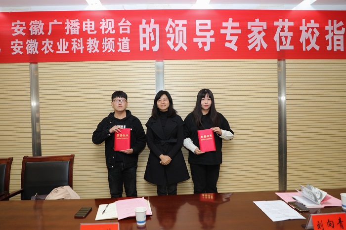 近日,我校弘扬社会主义核心价值观大学生微视频作品征集活动评审结果揭晓。11月11日,安徽广播电视台农业科教频道《皖美乡村》栏目制片人祝萍、栏目主编刘向青、制片主任王力一行在与我校涉农相关专家共商助力乡村振兴及校媒合作事宜之际,应邀出席颁奖仪式并为获奖代表颁奖。