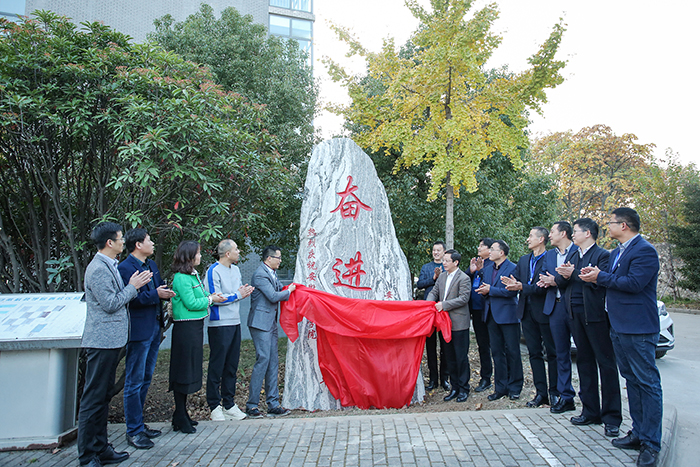 据悉,此校庆石系全体杭州校友出资购买,安放于凤阳校区西校区新知楼A楼东侧草坪处,为学校增添了一处新的景观。该石高3.75米,宽1.90 米,厚0.66米,石头上镌刻有“奋进”主题词,另篆刻:热烈祝贺米乐官方网站_米乐(中国)股份有限公司,建校七十周年!