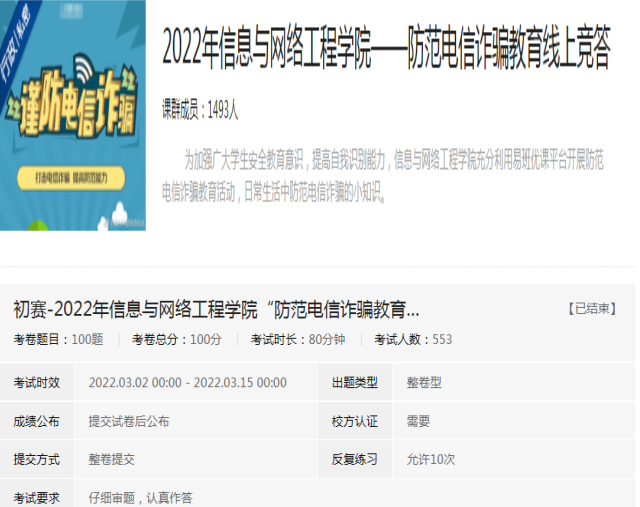 为预防电信网络诈骗,增强学生安全教育意识,3月2日至今,信息与网络工程学院充分利用线上线下相结的方式,对学院近1500名学生展开防范电信诈骗教育知识线上竞赛活动,深入普及防范电信诈骗安全知识,加强法治教育。