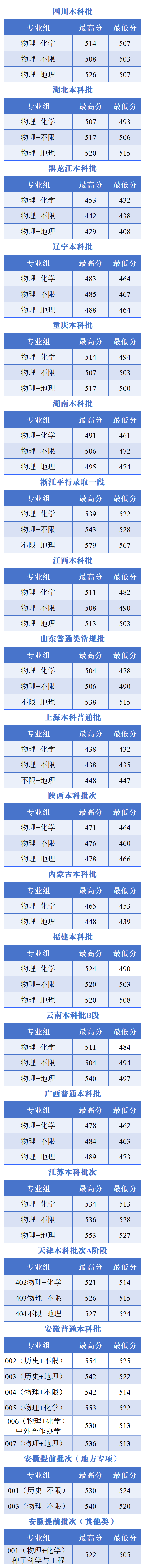 截至7月28日,我校已完成安徽省本科提前批次、地方专项、普通本科批;天津市本科批次A阶段;江苏省、云南省本科批B段;广西、内蒙古、陕西、上海、山东、江西、重庆、辽宁、湖南、河南、河北、黑龙江、湖北、福建、四川本科批;浙江平行一段等录取工作。